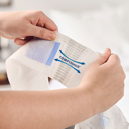 Der neu gestaltete COMFIStretch™ Hüftbund passt sich unterschiedlichen Körperformen an. Auf diese Weise sorgt er für einen bequemen Sitz und hervorragenden Auslaufschutz. Er kann beliebig oft geöffnet und wieder geschlossen werden, ohne seine Verschlusseigenschaften zu verlieren.