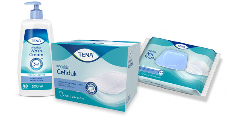 - TENA Wet Wipes Feuchttücher oder ein Reinigungstuch (z. B. TENA Cellduk) in Kombination mit einem Reinigungsprodukt wie eine Waschcreme (z. B. TENA Wash Creme) oder ein Waschmousse (z. B. TENA Wash Mousse)